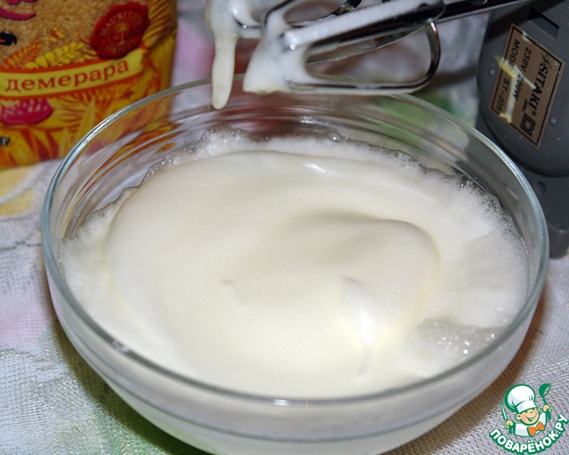 Белки взбить в крепкую пену с добавление щепотки соли.