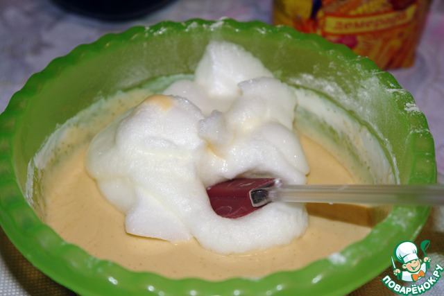 Добавить белки к основной массе в два приема, аккуратно перемешать.