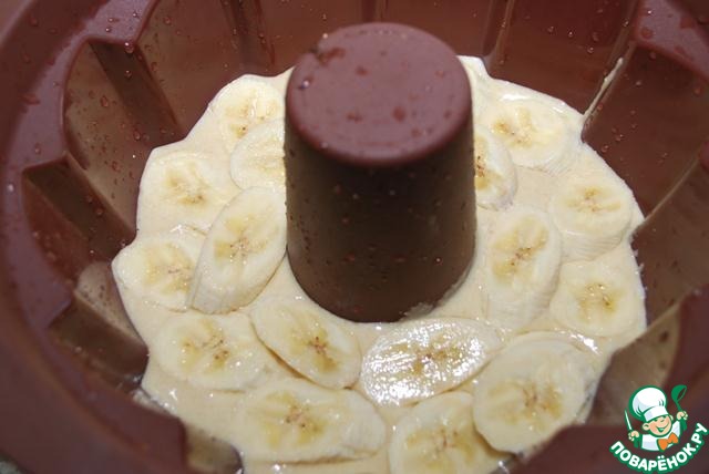 В форму выкладываем один слой, я обычно нижний делаю шоколадным, но это дело вкуса... На него выкладываем один слой бананов.