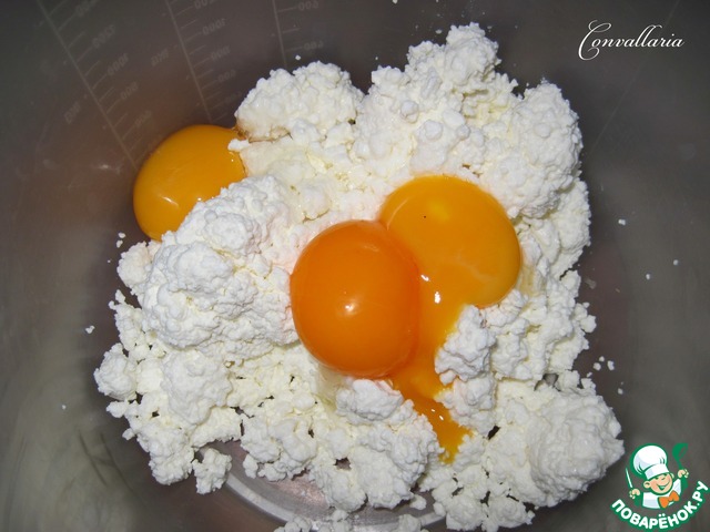 Творог растереть до однородной массы с желтками.