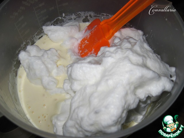 Белки взбить до крепких пиков и аккуратно вмешать в творожную массу (не миксером).