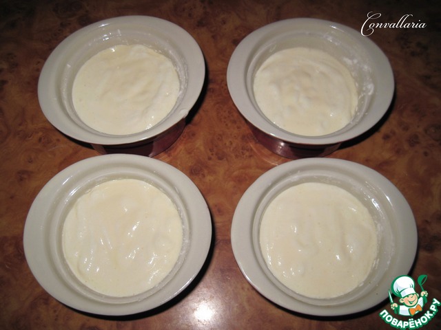 Формочки смазать маслом и присыпать мукой (я использовала керамические формочки, объем 120 мл., d 9см.). Чтобы пудинг легко вынимался из формы, дно и стенки можно выстлать пергаментом для выпечки.