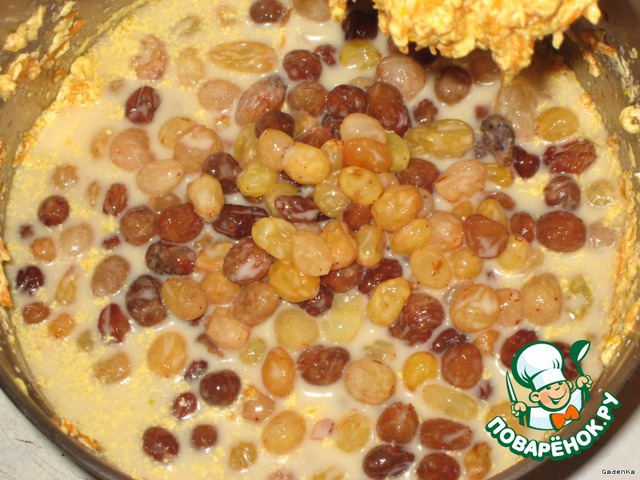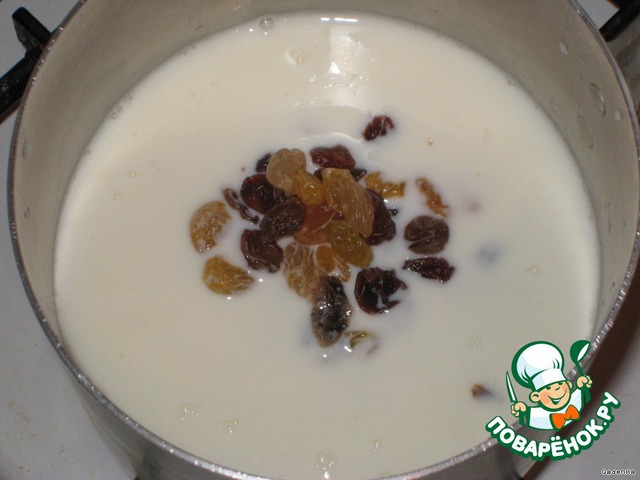 Изюм хорошо помыть, залить молоком и довести до кипения.