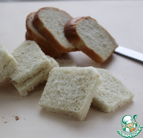 Нарежьте белый хлеб ломтиками, срежьте корки.