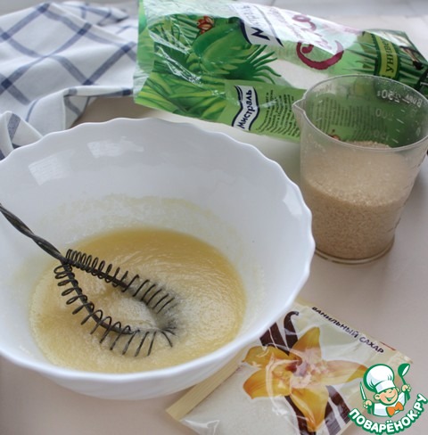 В миске смешать растопленное масло с коричневым универсальным сахаром от Мистраль, с ванильным сахаром всё размешайте венчиком или миксером.