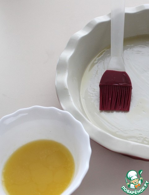 Форму диаметром 22-25 см смажьте растопленным маслом, притрусите мукой