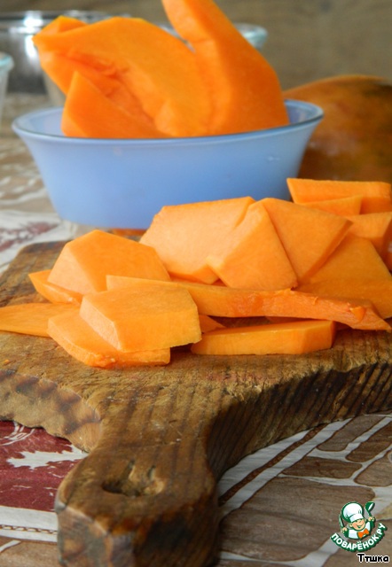 Тыкву очистить и нарезать тонкими ломтиками.