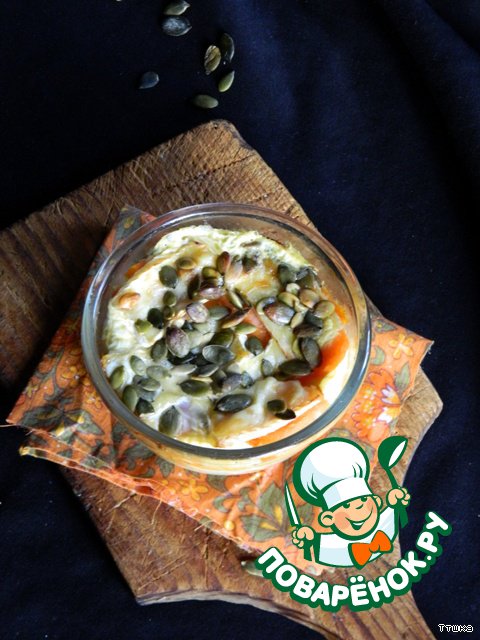 Яйца взбить с молоком, добавить мускатный орех и вылить все в форму, посыпать тыквенными семечками. Выпекать в разогретой до 180 градусов духовке в течение 30 минут. Подавать горячим или теплым. Приятного аппетита!