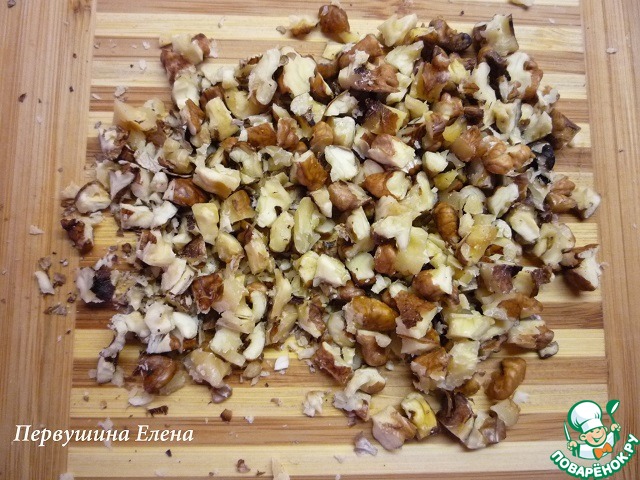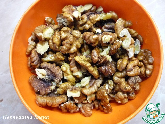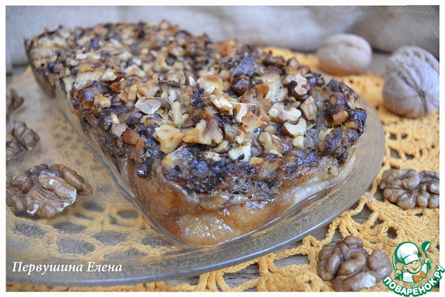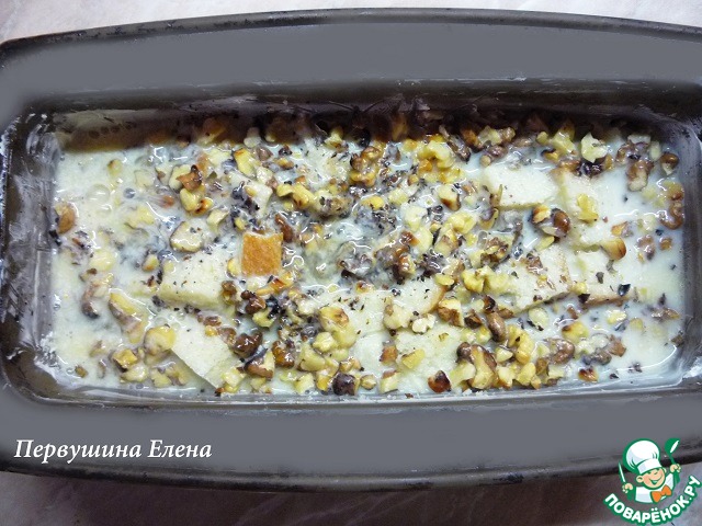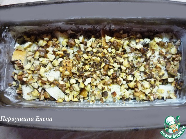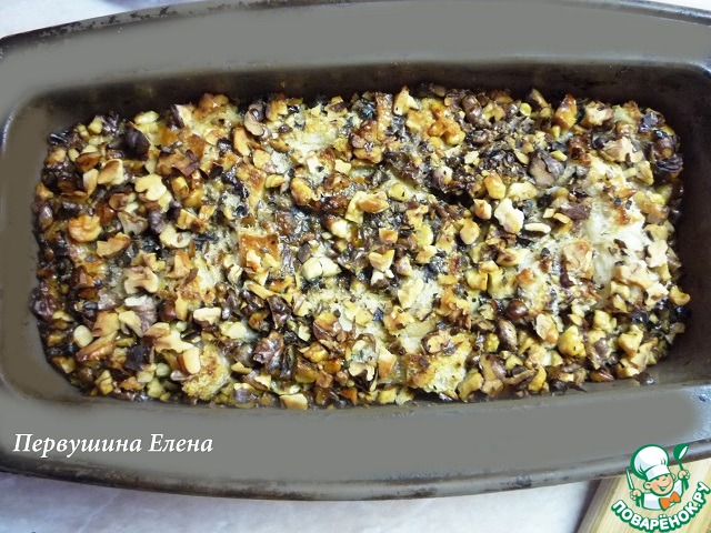 Посыпать поверх хлеба грецкими орехами, оставив лишь 1/4 часть.