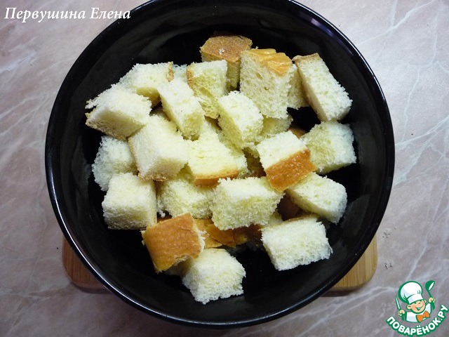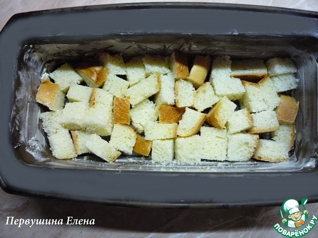 Смазать маслом форму для выпечки и выложить в нее ровным слоем хлеб.