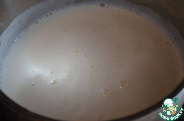 Постоянно помешиваем до получения однородной массы. Смесь сначала запениться, а потом загустеет.