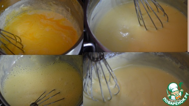 Слегка взбиваем желтки с 45 г. сахара. Когда рис будет почти готов, влить в него взбитые желтки с сахаром и немедленно перемешать. Вернем на медленный огонь и, постоянно перемешивая, доводим состояние каши до густой сметаны. Желток загустит кашу (но будьте осторожны, чтобы не превратил в омлет), сделает массу такой шелковистой и красивой. Остудить кашу. Рис в это время еще больше разбухнет.