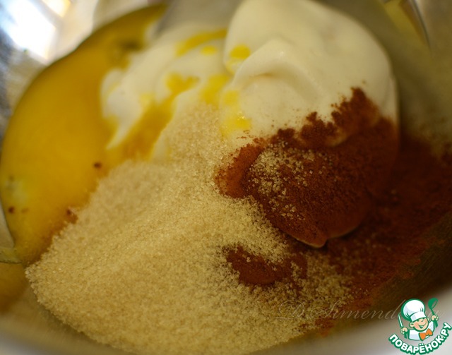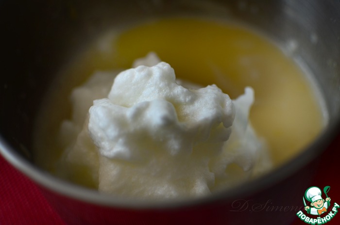 Смешайте треть взбитых белков, желтки, какао, вторую половину сахара.