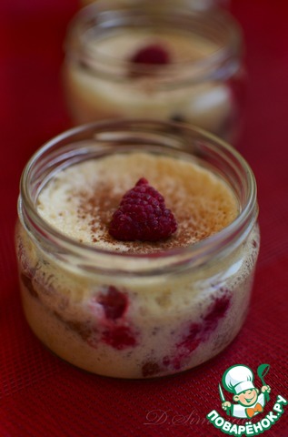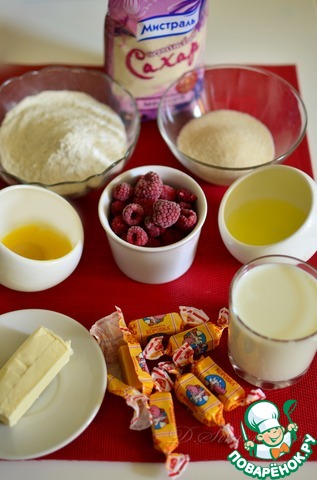 Конфеты "Коровка"-примерно 7 штук, 50г. сливочного масла, 250мл. молока, 1 ст. л. муки, 3 куриных яйца (белки отделить от желтков), 200 г. малины, 3ст. л. коричневого мелкого сахара Мистраль, (по вкусу ванильную эссенцию)