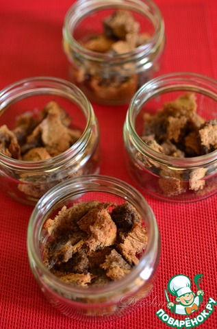 Подберите баночки одинакового размера. Это могут быть любые жаропрочные формочки, но через стекло лучше видно, что же там)) Бисквит поломайте на кусочки и уложите на дно баночек.
