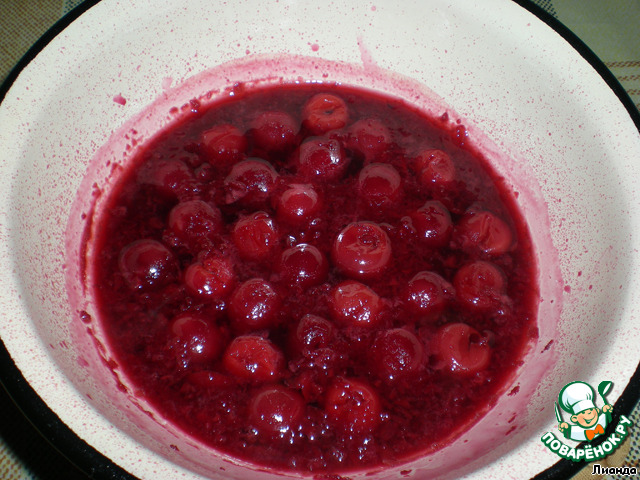 Сначала нужно приготовить соус. Половину вишен измельчить блендером. В кастрюльку всыпать сахар, влить 2 ст.л. воды или сока с ягод. Поставить на огонь и довести до кипения. Варить несколько минут. Затем добавить измельченные вишни, дать вскипеть и влить вино. Варить 5-7 минут. Добавить остальные вишни и проварить еще пару минут. Оставить соус остывать.