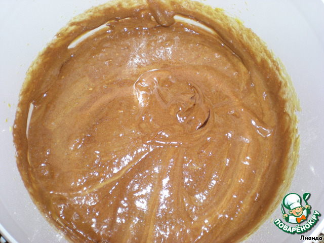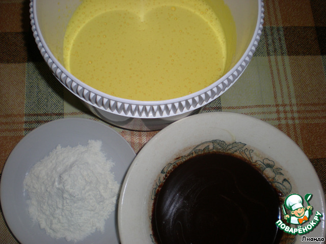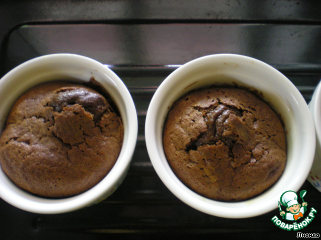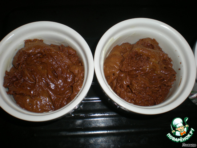 Займемся пудингом. В микроволновке растопить шоколад и масло. Остудить. Яйца с желтками и сахарной пудрой взбить в пену. Аккуратно смешать с шоколадной массой, а затем с мукой.