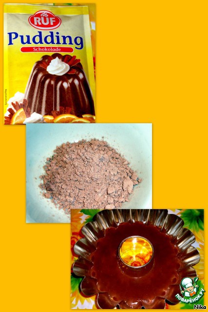 Шоколадный пудинг. Молоко я разбавила пополам с водой. Не с целью экономии. Боялась, что густая, сладкая, молочная смесь подгорит. На каждый пакетик нужно 500 г жидкости. Высыпала порошок из пакетика. Налила 100 граммов жидкости и хорошо размешала. Оставшуюся (400 г) жидкость поставила на плиту и довела до кипения. Смесь, осторожно помешивая, вылила в кипящую жидкость. Довела до кипения и сняла с плиты... Переложила густую смесь в форму для кекса. Чтобы быстре остыла горячая смесь, форму поместила в очень холодную воду.