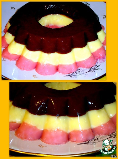 Коричневый пудинг в воде. На него переложила жёлтый пудинг. Затем розовый.