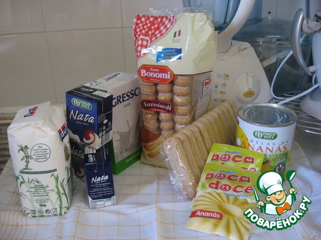 Ингредиенты (слева направо): сахар, сливки, молоко, сладкая выпечка, пудинг, консервированные ананасы