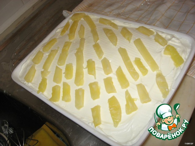Поверх пудинга кладем нарезанные кусочками 3-4 колечка ананаса