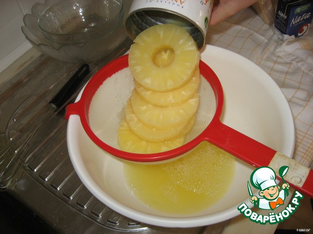 Когда пудинг остынет, отбрасываем ананасы на дуршлаг, чтобы стекли,