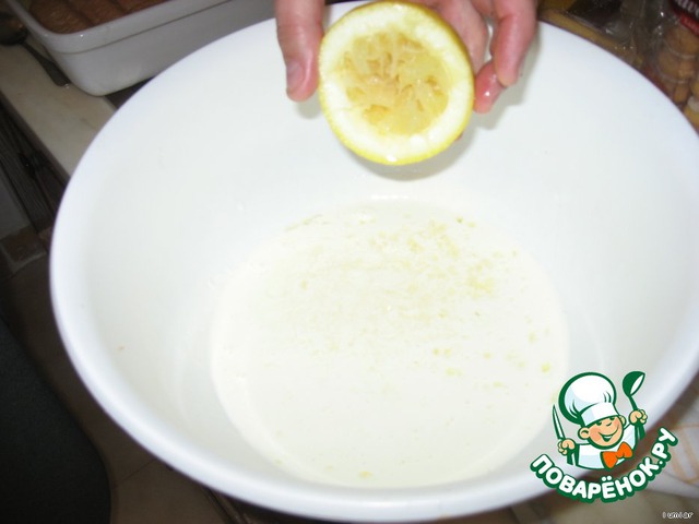 Затем выливаем в глубокую миску 3 упаковки сливок (я покупаю пакетики по 200 мл), выдавливаем туда сок из половины лимона (для лучшего взбивания, при этом вкус лимона не ощущается), довавляем сахар по вкусу (я люблю не очень сладкое, поэтому приблизительно 0,5 стакана, но можно и больше)