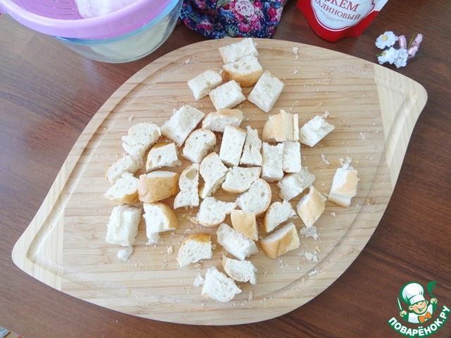 Утром приступаем непосредственно к приготовлению. Выложим половину хлебных кубиков в рамекины. Можно использовать одну большую форму для запекания.