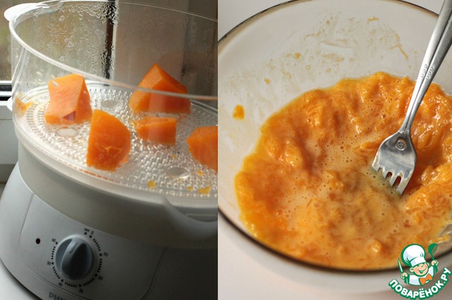 Если у вас свежая тыква, то просто припустите ее в блендере. У меня с лета лежат запасы замороженной тыквы, которую я готовлю в пароварке, а затем измельчаю просто вилкой.