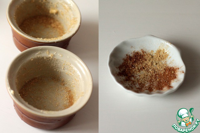 Формы для суфле смажем небольшим количеством сливочного масла, присыпаем сахаром и подготовим специи. Вообще, мой любимый Гордон Рамзи советует покрывать формочки маслом при помощи кулинарной кисти, нанося его снизу вверх, тем самым Вы образуете дорожки, по которым суфле поднимается.