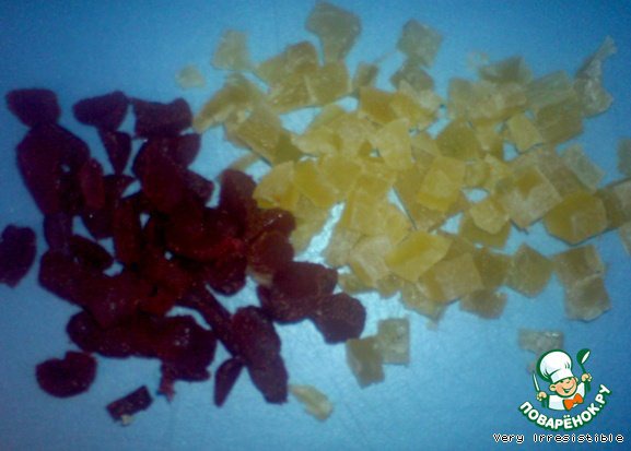 Режем на кусочки кольца ананаса и клубнику. Можно взять уже готовые кубики ананаса, да и вообще любые другие цукаты, какие любите.