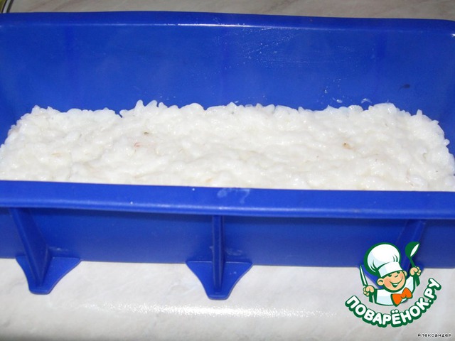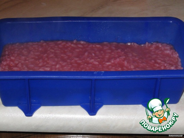 Сварить сладкую, густую рисовую кашу. Разделить на две части. В одну добавить вишневый сок и еще немного сахара. В форму выложить белый слой, а на верх красный. Запекать в духовке минут 20. В это время сварить вишневый кисель, как указано на упаковке, только взять наполовину вишневого сока. Дрстать пудинг из духовки, охладить и полить киселем.