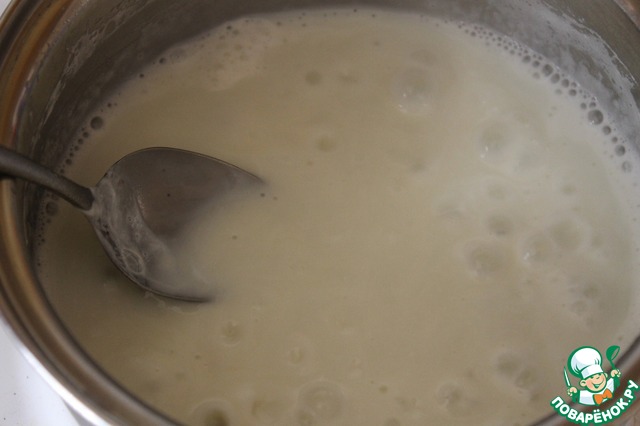 Остальное молоко 150 мл. с сахаром довести до кипения, влить разведенный крахмал, хорошо помешивая довести до загустения