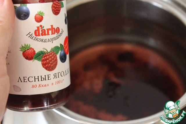 В оставшихся 150 мл. воды развести 2 ст. л. конфитюра "Лесная ягода" и довести до кипения