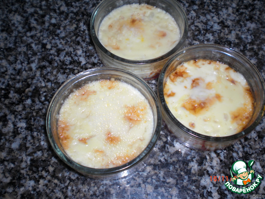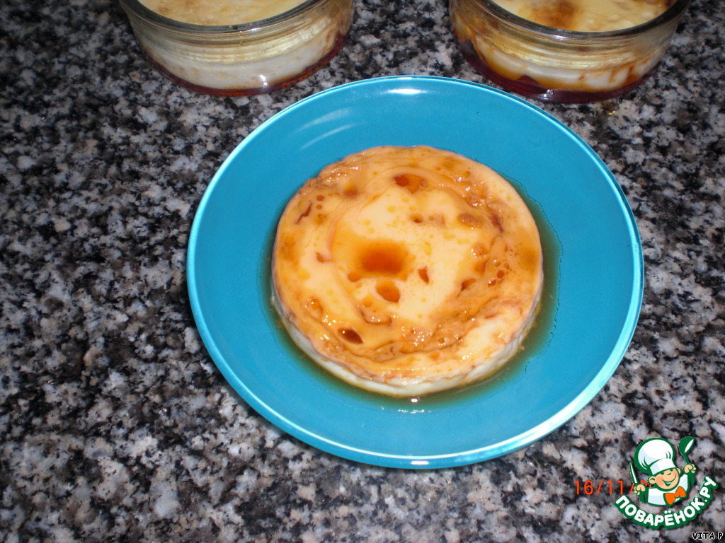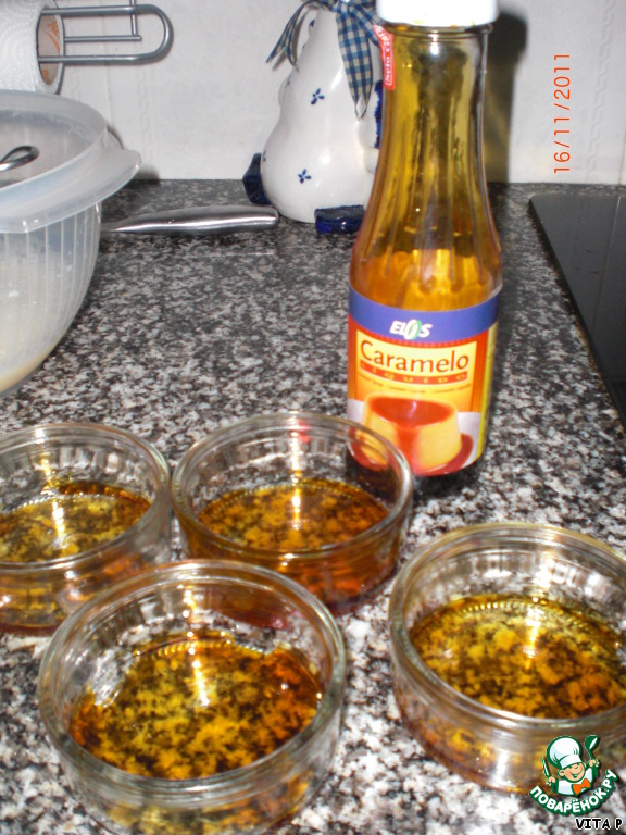 Небольшие формы смазать карамелью и залить небольшим количеством, где-то на половину формы, молочной смеси.