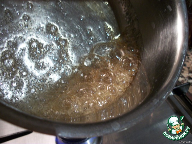 Приготовим карамель. Можно взять уже готовую, с ней тоже хорошо получается, но я решила немного заморочиться. Растопить 150 г сахара с двумя ложками воды в кастрюлечке и довести до кипения. Смесь должна загустеть и стать темно-коричневого цвета.