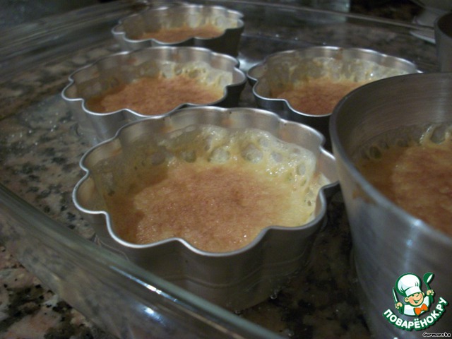Потихоньку вливать молочную смесь в яичную, тонкой струйкой. Как следует размешать и разлить по формочкам. Формочки должны быть уже помещены в огнеупорную форму для водяной бани. А духовка нагрета до 180 градусов.