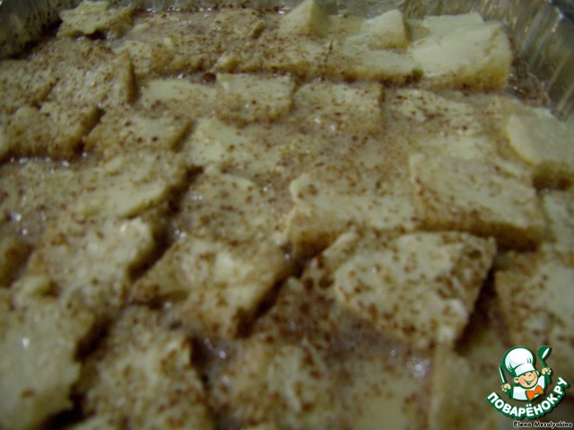 2. Форму смазать сливочным маслом. Каждый кусочек хлеба смазать маслом и плотно уложить в форму масляной стороной вверх.