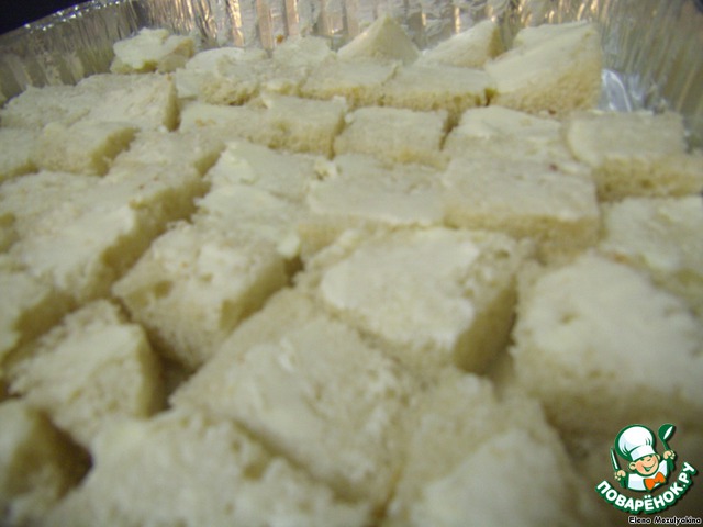 1. Хлеб порезать на небольшие квадратики (срезая корку)