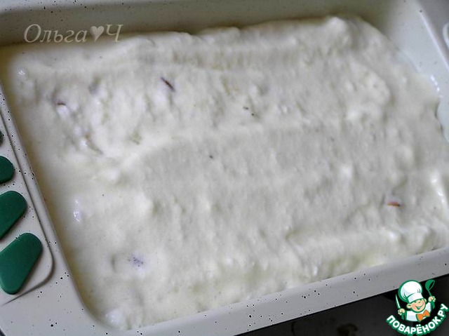 Белки взбить с сахарной пудрой до устойчивых форм пик, добавить к основной массе, аккуратно перемешать.