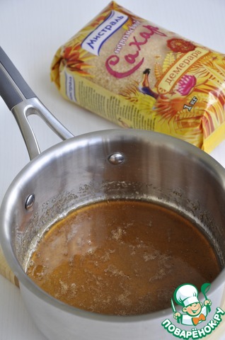 В сотейнике смешать 4-5 ст. л. сахара с 1ст. л. воды. Варить на тихом огне пока сахар раствориться и превратиться в карамель.