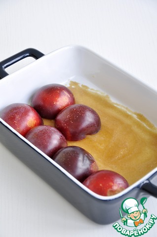 Смазать дно формы карамелью, выложить половины слив разрезом вниз.