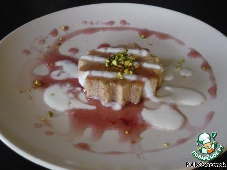10. Сервируем. Этот десерт лучше подавать со сладким фруктовым сиропом или вареньем. Мне также нравится двойная заливка из какой-нибудь кисломолочки и варенья. На фото йогурт и сливовое варенье. Украшено рубленой фисташкой.