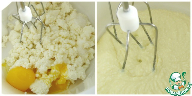 2. Отделить белки от желтков. Желтки, творог, сахар и ванильный сахар - взбить в миксере до однородности.