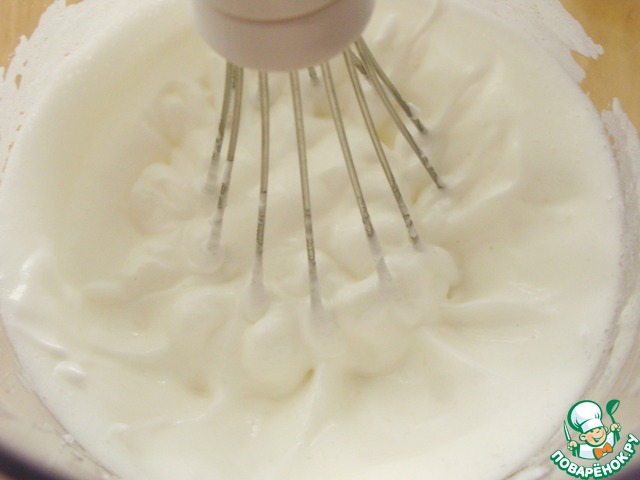 3. Белки взбить с сахаром до крепких пиков.