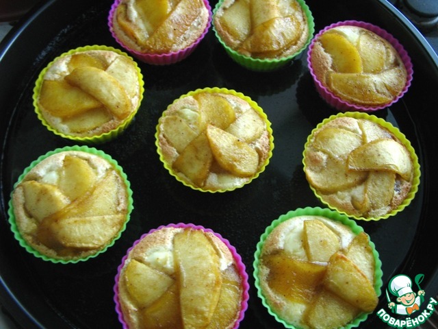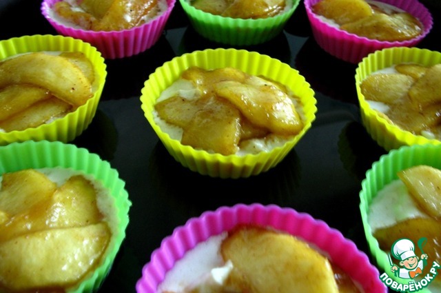 8. Духовку разогреть до 180 градусов. В силиконовые формочки выложить слоями сначала 1,5-2ст. л. овсяной смеси, затем 1 ст. л. творожной смеси, сверху выложить карамелизированные яблоки. Поставить формочки на противень и налить в него воды до середины форм. Выпекать пудинг 20-25 минут до готовности.