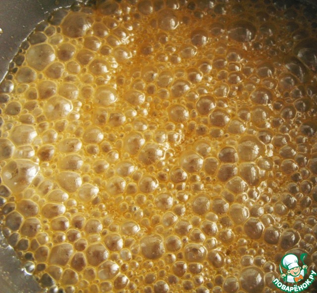 6. На сухой сковороде растопить 100 г сахара с 1 ст. л. воды. Когда сахар станет слегка золотистого цвета, добавить 30 г сливочного масла, растопить его до образования однородной золотистой карамели, снять с огня.