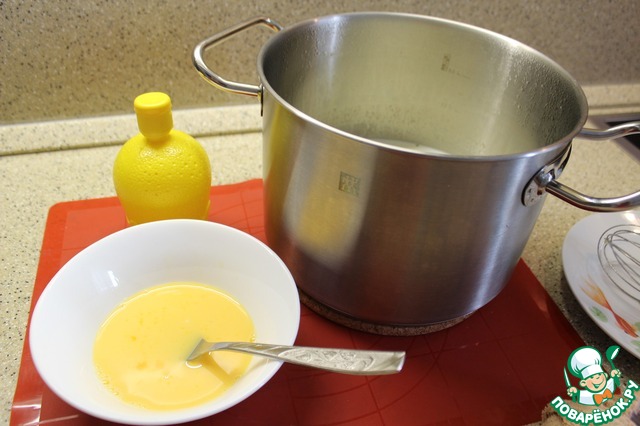 Разбиваем в миске три желтка с тремя ложками лимонного сока. Вливаем в миску, при постоянном помешивании, немного горячего (60 -70 град) молока.