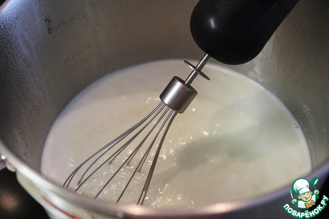 Выливаем оставшееся молоко, перемешивая энергично венчиком, ставим на плиту и нагреваем на среднем огне до закипания. Готовим одну минуту и снимаем с огня.