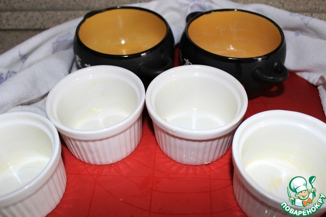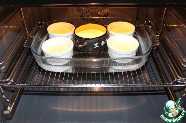 Устанавливаем порционные формочки на противень, раскладываем горячий пудинг, заливаем в противень воду примерно до уровня середины формочек и устанавливаем в духовку, нагретую до 180 град. Сверху прикрываем куском фольги. Запекаем 20 минут.